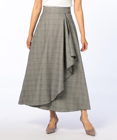 フレアシルエットがエレガントさを演出するマキシ丈スカート。フロント部分には、優雅なドレープを効かせたデザインを加えました。ボリュームがあるので、トップスにはコンパクトなアイテムが好相性。同デザインのビスチェと合わせてコーディネートするのもおすすめです。