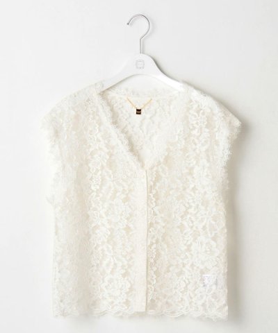 コードのリバーレースを使用した存在感のあるデザインが魅力のブラウスです。衿ぐりから前立て、袖口にも細巾のフランス製リバーレースを贅沢に使用しています。前開き仕様のため、ジレのように羽織りとしてもご着用いただけるので、様々なコーディネートに重宝しそうな一枚です。
