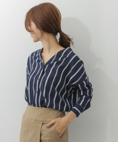クリーンな印象のストライプブラウスを上品なとろみ素材でご用意。
