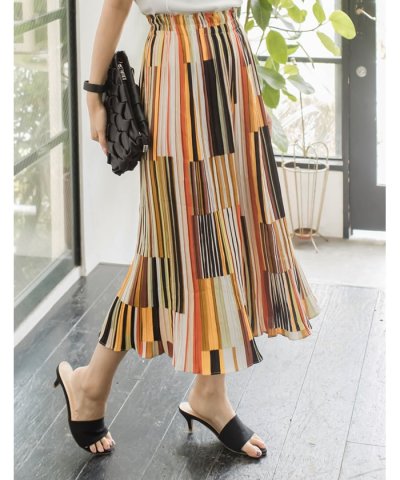 視線を集めるレトロなマルチストライプ柄のボトムスなので、シンプルなトップスを合わせてボトムスを主役に。