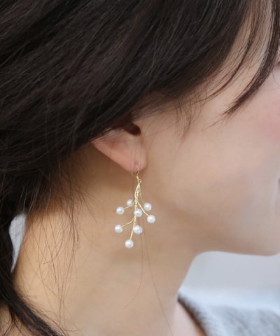 パールがたっぷりと付いたまるでツリーのようなデザインのピアス。 見える角度によって見せる表情が変わり、顔周りを明るく飾ってくれます。 フックタイプのモチーフが下がったデザインになりますが、パールが固定されているので、 デザインを保ったまま着けられ、また軽量なので長時間着けていても疲れにくいのもポイントです。 イベントが多くなるこれからの時季にオススメです。