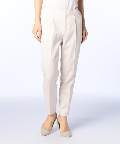タック入りの立体的なシルエットとセンタープレスが美しいパンツ。裾にかけて細くなるテーパード型で、スタイル良く着こなせます。オフィスシーンにも対応するきちんと感があるデザインなのに、ウエスト後ろはゴムで履き心地楽チンなのも嬉しいポイントです。